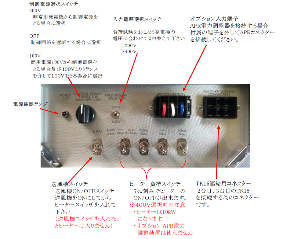 当製品は非常用発電機の負荷試験用に設計されています。それ以外の用途に使用しないで下さい。